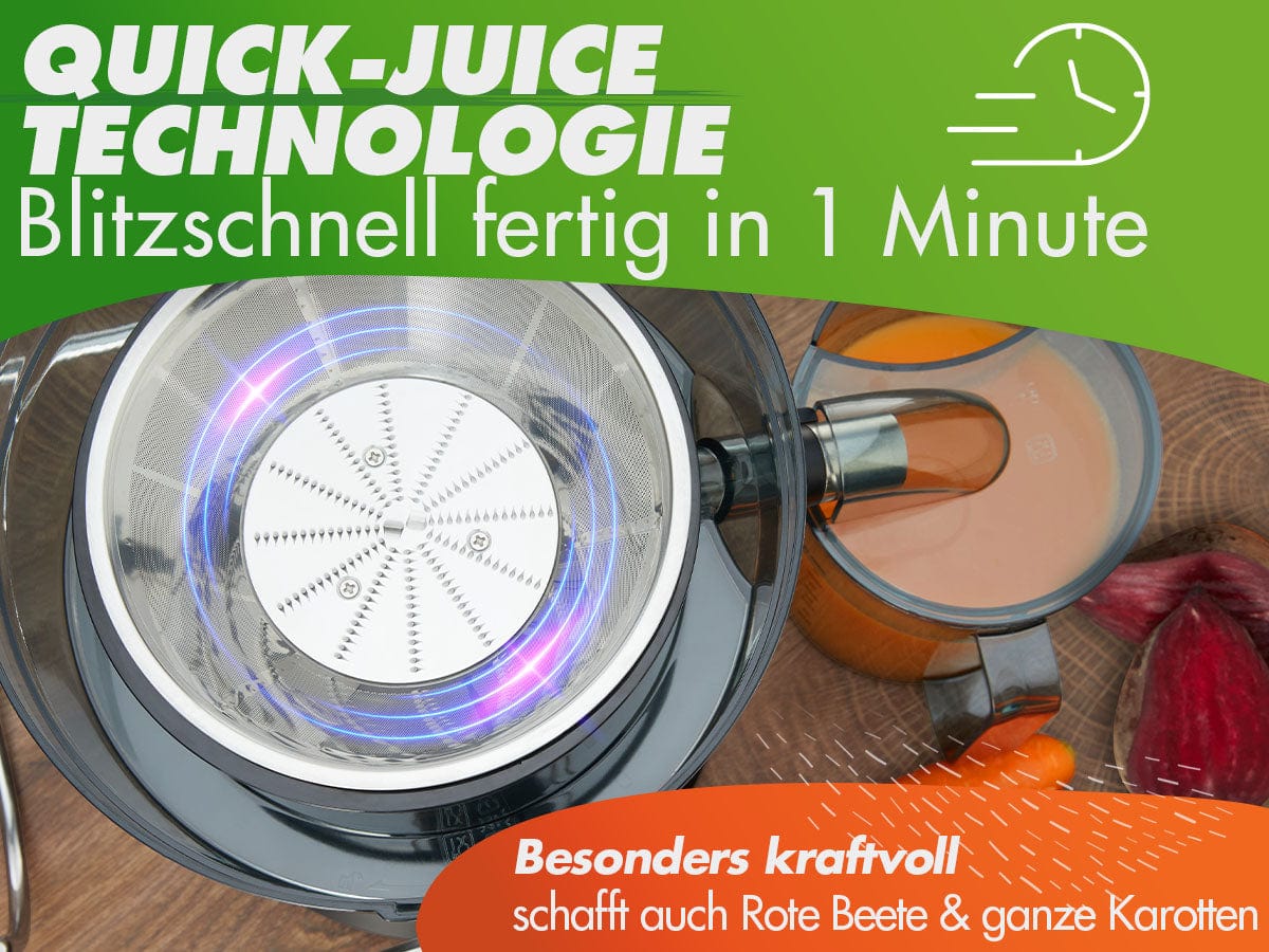 The QUICK-JUICER MAX sets itself apart from conventional centrifugal juicers. Thanks to its unique QUICK-JUICE technology, it extracts juice quickly and efficiently from fruits and vegetables while preserving flavor and nutrients.