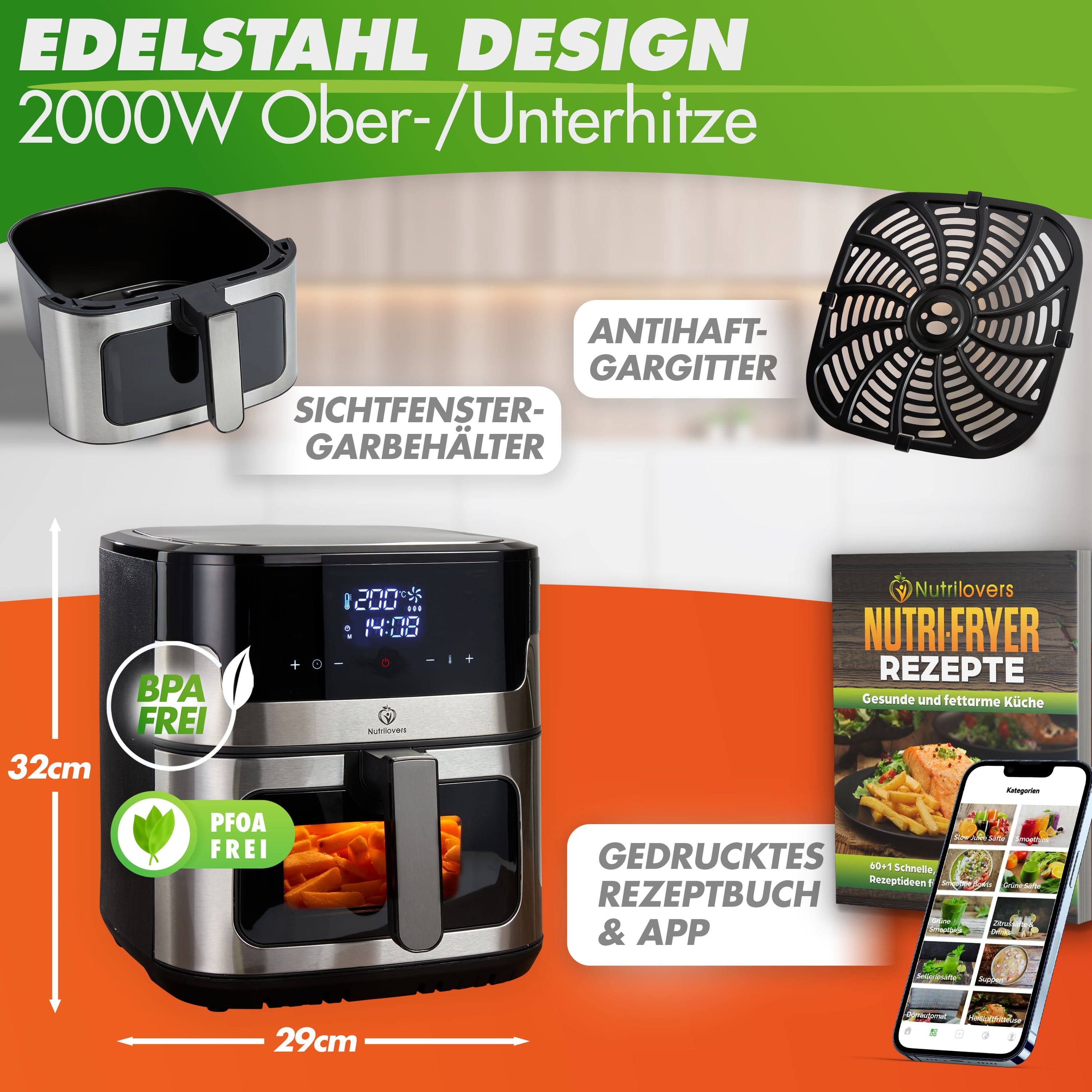 🔥EDELSTAHL DESIGN - Premium Heißluftfritteuse mit Sichtfenster